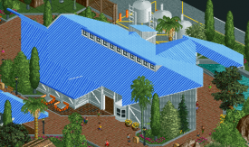 Another use of the curve. The offset 3x2 boxes and the big warehouse building in the back are fine, but mundane. The curved section solidifies this as a theme park building and the path types underneath help reinforce it.