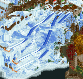 The winter section is also fantastic. Love the little orange fences at the end of the slides, and the frozen waterfall. Also glad that you carried the brown path into this area - good contrast. I love how tall and imposing the main building is. Great first drop. Good choice using the different hue of blue for the path on the interior of the building, and the deeper blues to achieve depth. Very thoughtfully done. Absolutely love how the ice skating section is being supported by those pillars of ice with the track below. Incredibly well thought out and executed. Again, the darker shades of blue really sell the depth in this particular spot.