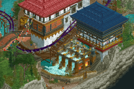 Some of the cutouts on the map edge are very fun. I'm usually not a huge fan of (often thoughtless) cutouts on the map edge (which so often exist just for additional content, not because they fit) while the rest of the map edge is just the usual rct map border. But your map edge looks great and has a lot of thought to it and all of the cutouts belong to the park's setting and story and make sense in where they're located. You included a lot of things that are related to the map's theme and to Bhutanese culture. That's great. Probably some of it is lost on me as I don't know all that much about Bhutan but the whole theme and underlying idea was of course instantly recognizable.