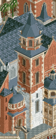 the orange rooves are likely true to the real life version (i'm assuming this is a real castle in krakow) but they are garish from this airborne perspective. however they do vibe VERY nicely with the eggshell blue towers. beautiful.