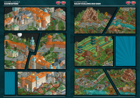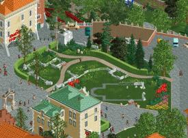 I think the two drawbacks here are firstly, it feels like you guys mainly wanted to do exactly that: recreate part of Krakow, rather than build a theme park - and then the coaster feels like it's there almost to justify it as an H2H entry. I'd have liked to have seen a carnival taking over the castle, or the nearby town, at least some more rides - not just for the RCT of it, but to bring the map to life a little more. The hot air balloon is a nice touch, and the bicycles riding along the riverfront get us a little bit more there.