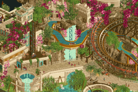 if the last park felt like the future, this one felt classic to me. in the best way, this feels like a park i would have loved to make. the aesthetic feels recognizable without being played out, a new twist on an old favorite. the pink and yellow color pops are incredible, and the maximalism is something that i love when it's done well. and it's done SO well here. also, while we're chatting about sound design, the waterfalls and animal sounds. FUCK. it's amazing. every park of mine will have this in there from now on. it adds so much. why has no one really done this before. we're all idiots.