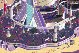 + This park feels huge! Even with the same 70x70 space as the other playoffs parks, you've gotten a lot more out of it through verticality. The layered-ness of the rides and scenery add to this, and I love how much there is to discover just by rotating the camera.