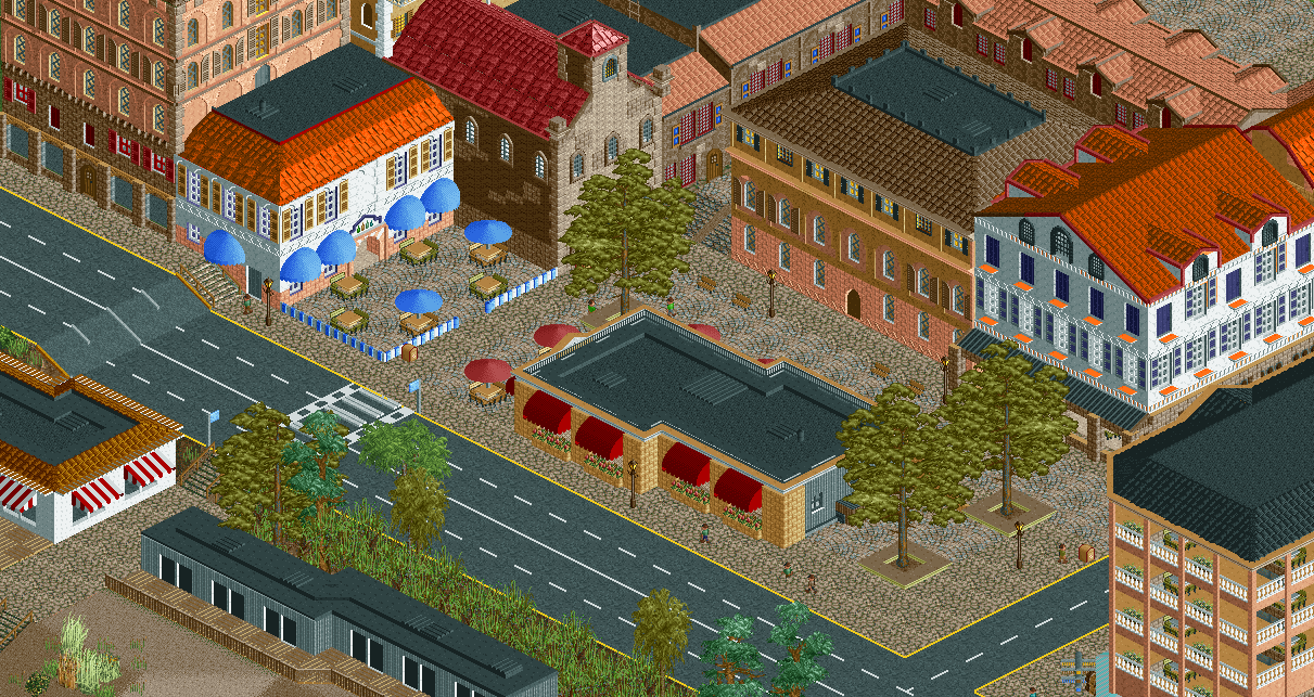 MK this is cool. Nice space planning, The scale and varied bldg elevations read well also. The smaller 'cafe' styled bldg (with the red canvas awnings) where brick meets stone path kinda gets lost for me BUT (i'm kinda color blind) seems like a curb type slab edge would separate the two textures a bit better. The roof designs and style look great. Maybe change the duct and vent colors to break up the black a little.. Bldg elevations looking cool too.. WELL DONE! in my simple opinion
