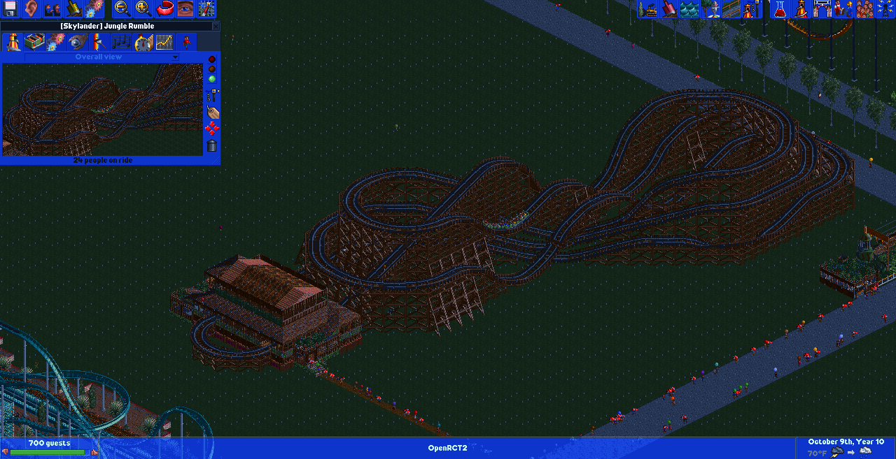 It's a jungle rumble, but I don't see any jungle! Layout isn't bad, but I think you could tweak a couple turnarounds to have the track run under or parallel to existing structure. It's all a little stretched out with every turn and every hill crest being two-stage.