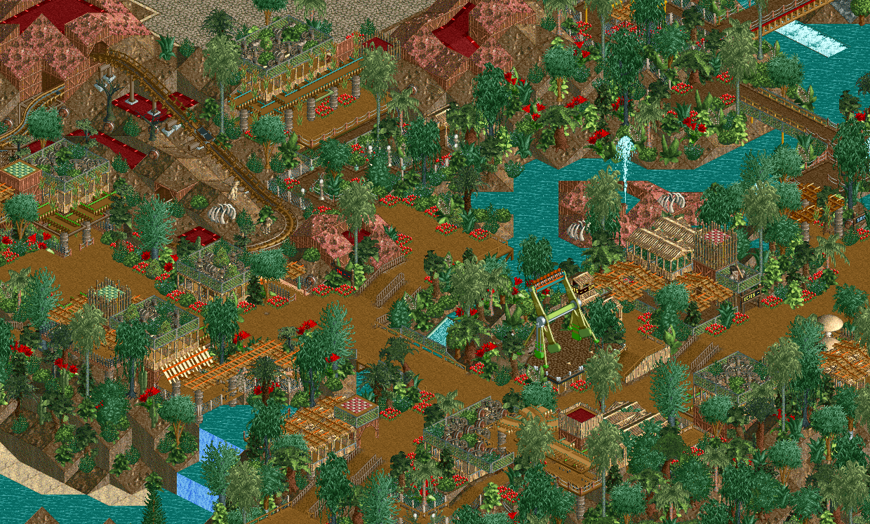 This park is so hard to digest, but when you single out an area in a screen, from a good angle, the park will make a good case for itself being one of the best parks ever. This area out of context is beautiful and not quite as dense as BGSS is in my head. The theme is not very accurate, but that's typical for this era a feel. Come up with a cool theme, and slap a loosely fitting name on it. The theme is not Galapagos, but an isolated tropical island. Two motifs that I really like here: 1) the beautiful, but dangerous landscape. Volcano craters everywhere, bones, carnivorous plants, and the red flowers. The blowhole is also a brilliant touch that you could fit under this umbrella. 2) the architecture is almost entirely consisting of wooden objects of all types, like it's slapped together from parts of a stranded ship. This looks like a castaway settlement. Look at those 2x2 rooftops!