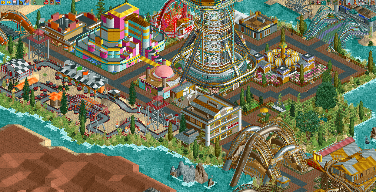 It's the center point it's the prelude to the rest of the park and opens up to the other flavors. It's mostly art deco but I wanted a good colllage of colors. I wanted to make it a little village on the middle island where guests can eat and relax before exploring the back half. Few things I should add sure but the colors and THE TOWER! The pinnacle of the park, the hedge maze isn't the only thing.