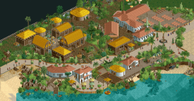 This is an excellent debut screen, wow! There's not a lot to dislike, and a lot to love. I like the diagonal building, and I assume there are going to be more diagonals here and there. The more you do stuff like that, the more it will look like it belongs. I don't mean everything has to be diagonal, but just make it a recurring thing. The yellow roofs are a good example of this. I always say you can get away with a lot, as long as you're consistent. The roofs make more sense as tan or another shade of brown, but you chose yellow for some reason. You did it consistently, and it looks great!