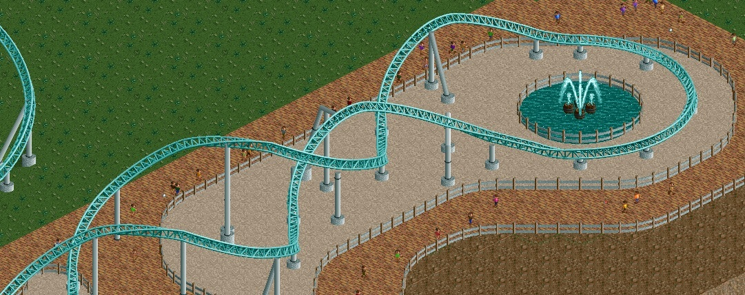 Layout looks wonderfully flowy, would love to ride it! The environment is a lot of wasted space though. An idea could be to lower the ride by one unit, as well as the land below. Trenches following the contours of the coaster always look good. You can also make the path hug the coaster more. The straight shape of the path doesn't do the nice curves of the coaster justice