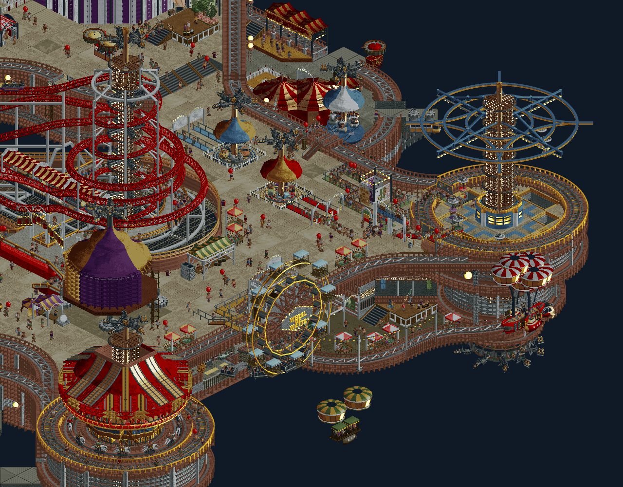 Spiral coaster tower, parachute drop floor and queue, airships, lower seating area, big circus tent at top, most of the frame, and additional stalls and details by TimmyTuner. -