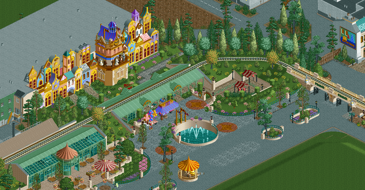 I always like to see a mash-up of existing theme parks. Great job on this ride! Really good path spaces, and I like how you integrated the train ride. Do the red circles in the path represent clown noses?