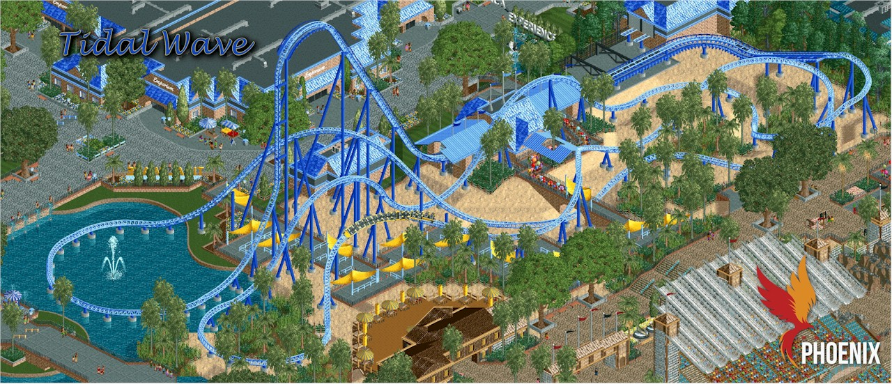 CP6 notes - Tidal Wave is Intamin giga coaster in the vein of Pantherian/Intimidator 305 crossed with a Mega Lite. It's purposefully scaled down for RCT to make the structure look more proportional. I've never been a fan of the ride experience on Pantherian so I wanted this one to have a bit more vertical undulation. The symmetry of the first corner and the mid-layout turnaround was important to the point that these two sections were built first before filling in the gaps in between. Tidal Wave had replaced Orca in the original release of HOA and I had always been very proud of that layout. Part of the goal here was to make something in a similar style yet still distinctly different to allow it to exist on its own. I love the first turn being placed out of the water and can imagine the view both as a rider and a non rider would be spectacular.