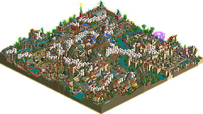 Pinnacles - Damn! It's like Twisted came out of retirement. This park is very in your face and packed, but also kinda piled up, not really in a the best way throughout. The Russia area is amazing, loved it! The Rocinha area was good, was happy to see an old school hacked coaster. The Asian area had its moments and an actual realistic coaster... which seemed a little out of place in this park, but I liked it anyways. The medieval area was a little weak, but I loved the default huts being used as castle themeing. The codex'ed clouds didn't really add much imo, but also didn't hurt the park. Nice to see you guys use peeps and the single-wide paths are kinda acceptable here. Very impressive work!