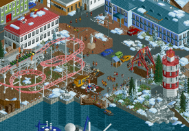 as brilliant as I expected from you two. This is up there with the most detailed (but clean) pieces of rct2 I've ever seen, with crazy curves, 30 deg diagonals, and just an intense precision to everything, from lifeboats on big boats (love this detail) to rigging on ships, etc etc. I loved using the diagonal tram as the ship bridge- brilliant. The mine train was a tad slow/boring for me, but I loved the pieces I could see. Very bold decision to put the duelers out on the flat ice like that- its not a design decision I would have made, but I love it anyway. A cool layout. I enjoyed how much you poke fun at the whole ecological disaster situation, while still feeling like a sincere message. On the whole though, despite how impressed I am at all the detailing, the big sculptures impressive me more, especially that hotel rotunda. How you have the depth of knowledge and architectural prowess to imagine these things amazes me so much... I can do uh 2x3 square buildings.